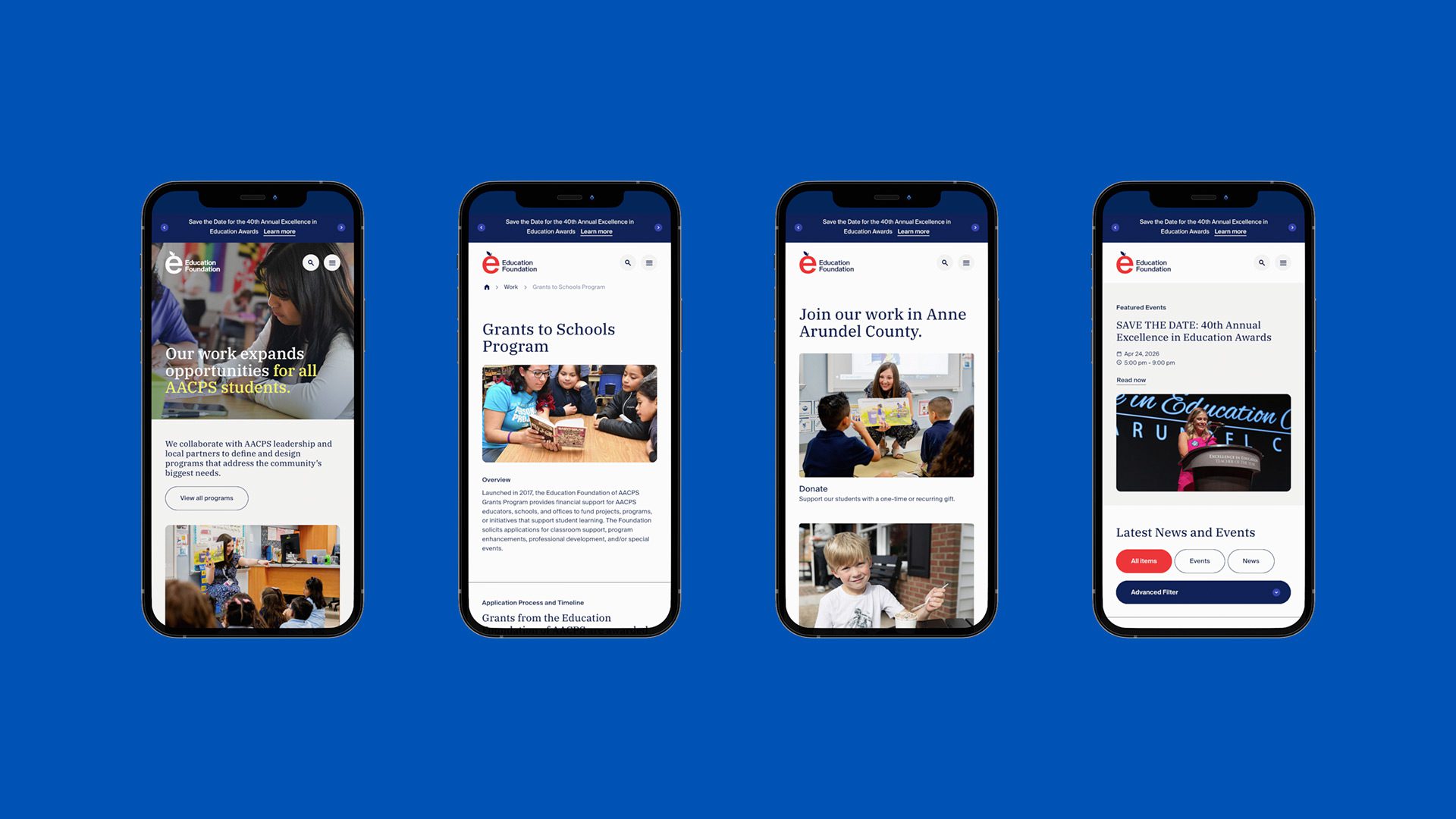 The Education Foundation of Anne Arundel County Public Schools (AACPS) is an independent nonprofit organization that facilitates innovation in the regional school system. The leadership team came to Neue Now with two problems: their brand felt stagnant and outdated, and their website was impossible to use.